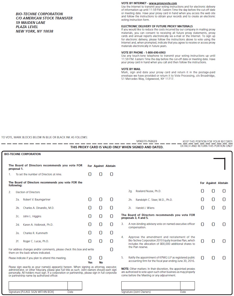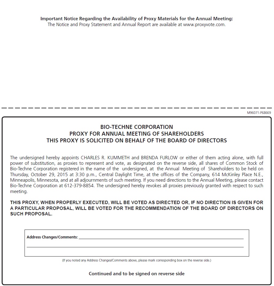 The 2015 Annual Meeting of Shareholders of Bio-Techne Corporation will be held at the principal executive offices of the Company, 614 McKinley Place N.E., Minneapolis, Minnesota 55413.